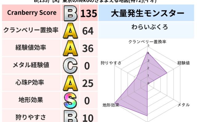 クランベリーボット判定結果の詳細クランベリースコア98クランベリー置換率77%大量発生モンスタードラゴンキッズ超耐性イオ(78%)超耐性・弱耐性なしドルマ系統狩りドラゴン系40%こころ道 完全一致モンスターどくろあらいゴッドハンド(守護道L...