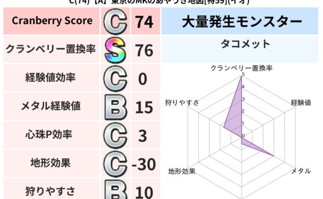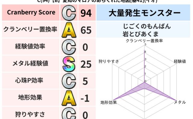 クランベリーボット判定結果の詳細クランベリースコア86クランベリー置換率76%大量発生モンスタータコメット超耐性イオ(59%)こころ道 完全一致モンスタースカルガルードラゴン(竜道Lv5)デビルアーマー大神官(舞道Lv5)さまようたましいド...