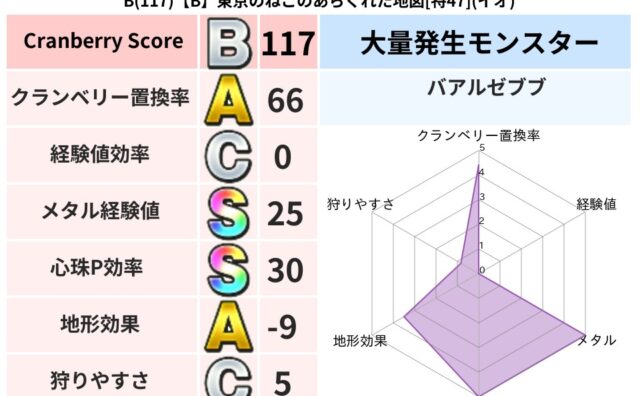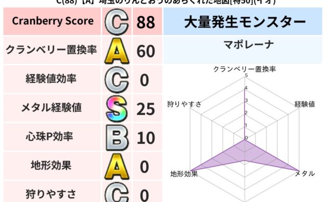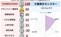 クランベリーボット判定結果の詳細クランベリースコア74クランベリー置換率65%大量発生モンスターリリパット超耐性イオ(0%)こころ道 完全一致モンスターどくろあらいゴッドハンド(守護道Lv5)みならいあくまニンジャ(風道Lv5)フレイム守り...