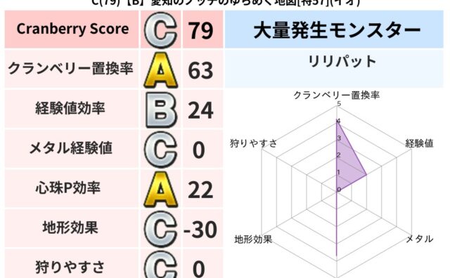 クランベリーボット判定結果の詳細クランベリースコア60クランベリー置換率62%大量発生モンスターぶっちズキーニャ超耐性イオ(38%)こころ道 完全一致モンスターねこまどうニンジャ(風道Lv5)ドロヌーバニンジャ(波道Lv5)メガザルロックゴ...
