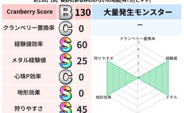 地図判定結果 B(130)【B】長野のあるみののろいの地図[特75](ヒャド) クランベリーボット判定結果の詳細クランベリースコア:130ヒャド超耐性(0%)超耐性・弱耐性なし:バギ,ドルマ,ジバリア系統狩り(45%)こころ道 完全一致モンスターいたずらもぐら: ゴッドハンド(守護道Lv5)ぶちスライム: 大神官(祈道... 2025/09/29 18:11 地図判定結果