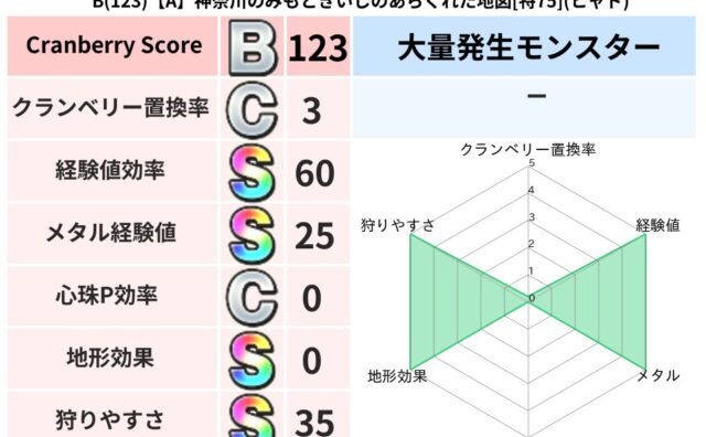 地図判定結果 B(133)【B】福岡のゆきのあやうき地図[特71](ヒャド) クランベリーボット判定結果の詳細クランベリースコア133クランベリー置換率80%大量発生モンスターマポレーナ超耐性ヒャド(80%)超耐性・弱耐性なしドルマこころ道 完全一致モンスターデビルアーマー大神官(舞道Lv5)しりょうのきし大神官(舞... 2025/10/09 18:14 地図判定結果置換率S