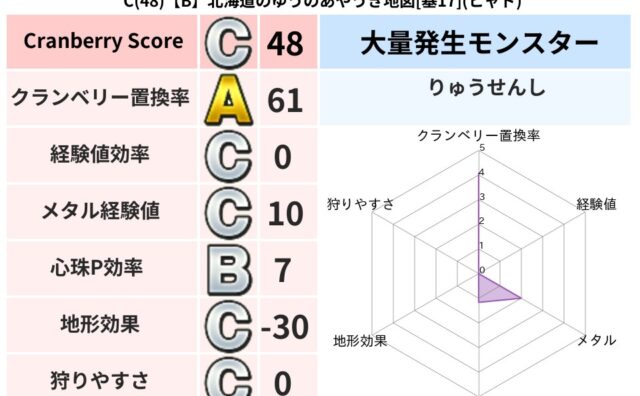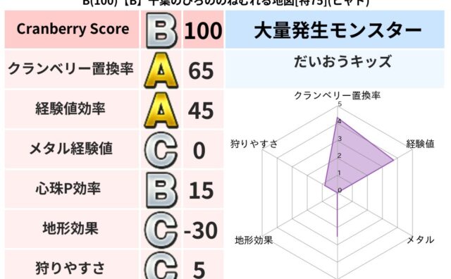クランベリーボット判定結果の詳細クランベリースコア:115クランベリー置換率:65%大量発生モンスター:だいおうキッズヒャド超耐性(93%)超耐性・弱耐性なし:ジバリアこころ道 完全一致モンスターくさった死体ゴッドハンド(守護道Lv5),大...
