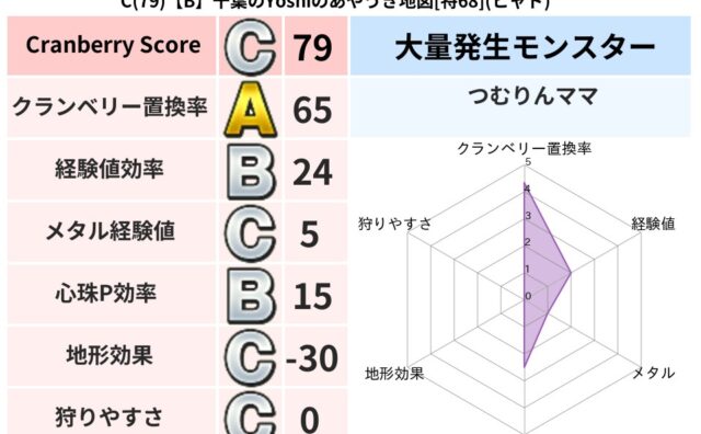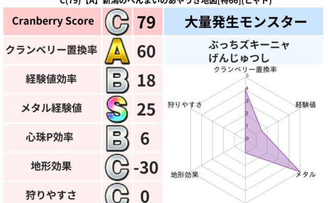 クランベリーボット判定結果の詳細クランベリースコア:127クランベリー置換率:40%大量発生モンスター:マッドフィンガーヒャド超耐性(0%)超耐性・弱耐性なし:デインこころ道 完全一致モンスターマッドフィンガー: 天地雷鳴士(天道Lv5)み...