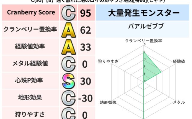 クランベリーボット判定結果の詳細クランベリースコア:95クランベリー置換率:62%大量発生モンスター:バアルゼブブヒャド超耐性(93%)こころ道 完全一致モンスターがいこつ魔剣士(共通Lv1)デビルアーマー大神官(舞道Lv5)アイアンクック...