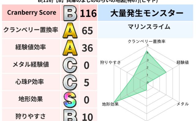 クランベリーボット判定結果の詳細クランベリースコア:116クランベリー置換率:65%大量発生モンスター:マリンスライムヒャド超耐性(0%)こころ道 完全一致モンスターかっちゅうアリ魔人(共通Lv1)まどうしゴッドハンド(守護道Lv40)ベレ...