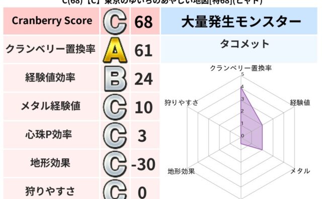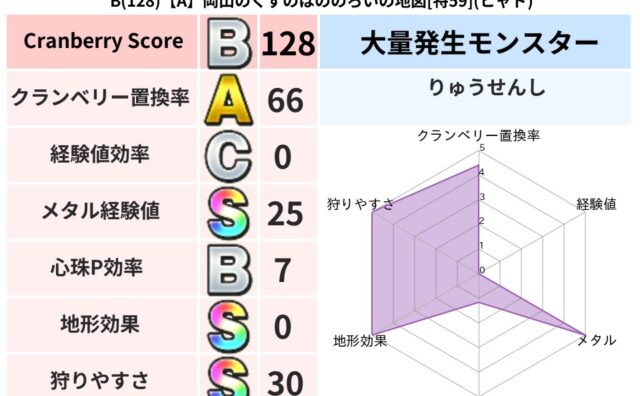 クランベリーボット判定結果の詳細クランベリースコア:174クランベリー置換率:80%大量発生モンスター:わらいぶくろヒャド超耐性(10%)超耐性・弱耐性なし:バギ,デイン系統狩り(45%)こころ道 完全一致モンスターさまようよろい: ゴッド...