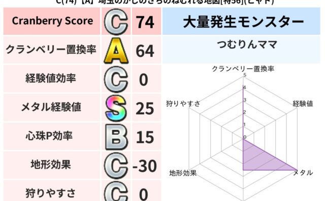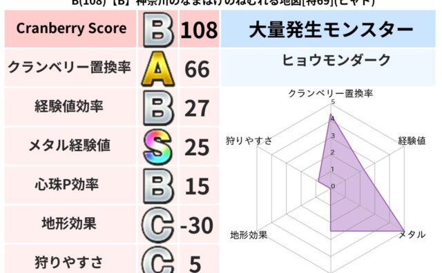クランベリーボット判定結果の詳細クランベリースコア:80クランベリー置換率:75%大量発生モンスター:りゅうせんしヒャド超耐性(16%)こころ道 完全一致モンスターどくろあらい: ゴッドハンド(守護道Lv5)デビルアーマー: 大神官(舞道L...