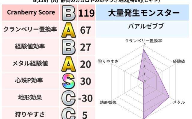 クランベリーボット判定結果の詳細クランベリースコア:113クランベリー置換率:68%大量発生モンスター:ヒョウモンダークヒャド超耐性(46%)こころ道 完全一致モンスターシャドー: ニンジャ(波道Lv30)デビルアーマー: 大神官(舞道Lv...