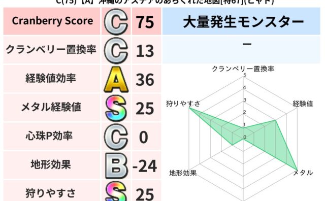クランベリーボット判定結果の詳細クランベリースコア86クランベリー置換率66%大量発生モンスターヒョウモンダーク超耐性ヒャド(17%)超耐性・弱耐性なしバギ系統狩り水系40%こころ道 完全一致モンスターベロニャーゴ大魔道士(理力道Lv5)キ...