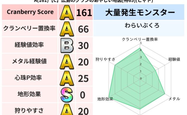 クランベリーボット判定結果の詳細クランベリースコア:100クランベリー置換率:67%大量発生モンスター:さそりばちヒャド超耐性(56%)こころ道 完全一致モンスターヘルボックル: 魔剣士(魔道Lv30)つかいま: 大魔導士(理力道Lv5)さ...