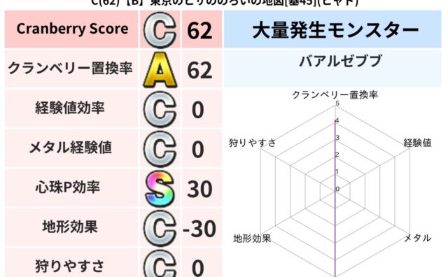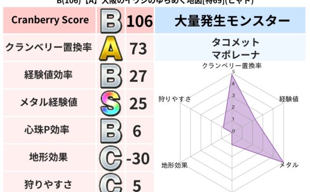クランベリーボット判定結果の詳細クランベリースコア114クランベリー置換率75%大量発生モンスターマリンスライム超耐性ヒャド(10%)こころ道 完全一致モンスターデビルアーマー大神官(舞道Lv5)キースドラゴン大魔道士(理力道Lv5)だいま...
