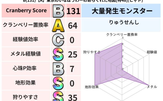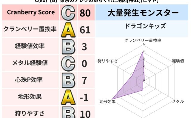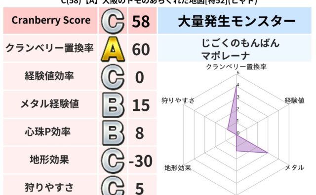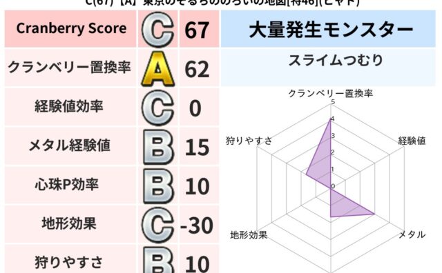 クランベリーボット判定結果の詳細クランベリースコア67クランベリー置換率62%大量発生モンスタースライムつむり超耐性ヒャド(51%)こころ道 完全一致モンスターみならいあくまニンジャ(風道Lv5)くさった死体ゴッドハンド(守護道Lv5)大魔...