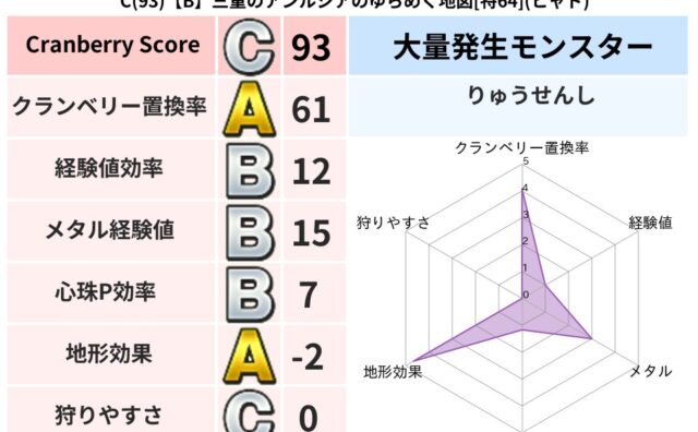 クランベリーボット判定結果の詳細クランベリースコア:118クランベリー置換率:66%大量発生モンスター:メーダロードヒャド超耐性(0%)こころ道 完全一致モンスタースカルガルー: ドラゴン(竜道Lv5)ジェリーマン: 魔剣士(魔道Lv5)グ...