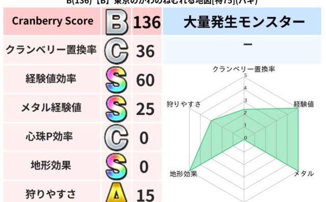 スコアA A(160)【A】東京のクジーラのゆらめく地図[特75](バギ) クランベリーボット判定結果の詳細クランベリースコア160クランベリー置換率47%大量発生モンスターブランマトック超耐性バギ(0%)系統狩りけもの系76%こころ道 完全一致モンスターブランマトック天地雷鳴士(地道Lv5)ベロニャーゴ大魔道士(... 2025/10/14 10:18 スコアA地図判定結果