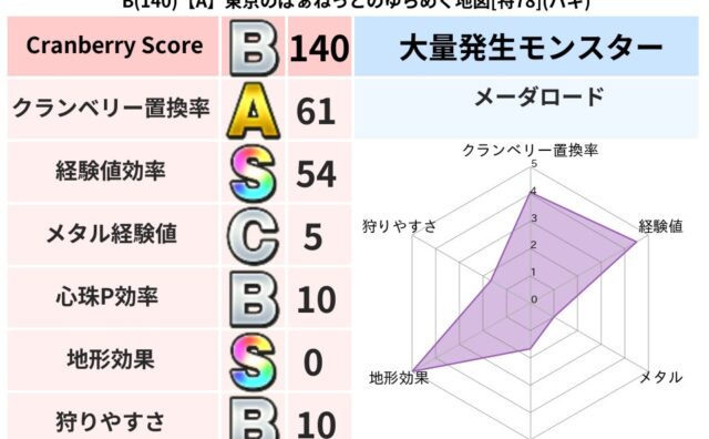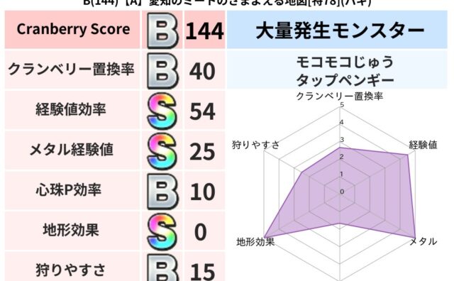 クランベリーボット判定結果の詳細クランベリースコア144クランベリー置換率40%大量発生モンスターモコモコじゅう,タップペンギー超耐性バギ(0%)超耐性・弱耐性なしデインこころ道 完全一致モンスターしのどれいゴッドハンド(守護道Lv5)大魔...