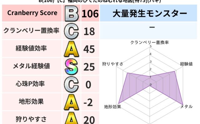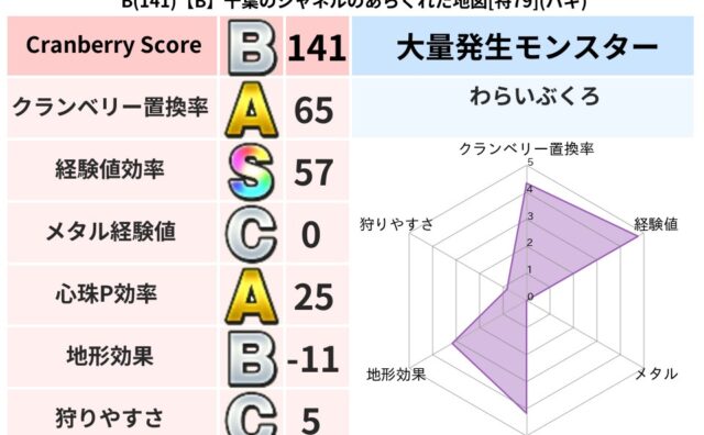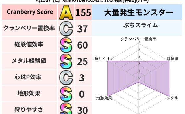 クランベリーボット判定結果の詳細クランベリースコア137クランベリー置換率29%大量発生モンスターブランマトック超耐性バギ(0%)超耐性・弱耐性なしヒャドこころ道 完全一致モンスターキメラ大魔道士(共通Lv1)みならいあくまニンジャ(風道L...