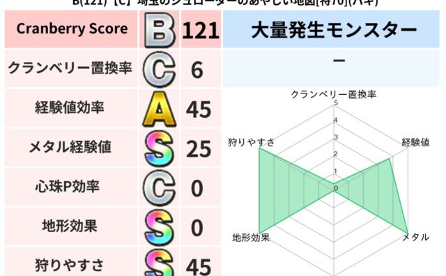 クランベリーボット判定結果の詳細クランベリースコア:121クランベリー置換率:6%バギ超耐性(0%)超耐性・弱耐性なし:イオ,ドルマ,ジバリア系統狩り(41%)こころ道 完全一致モンスタードラキー: 大魔導士(共通Lv1)どくどくゾンビ: ...