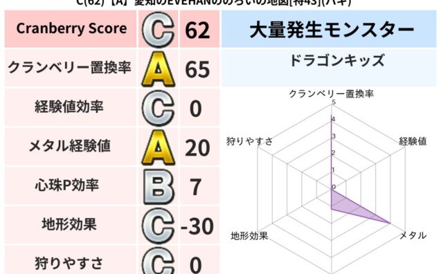クランベリーボット判定結果の詳細クランベリースコア147クランベリー置換率59%大量発生モンスターあらくれチャッピー超耐性バギ(0%)こころ道 完全一致モンスタースカルガルードラゴン(竜道Lv5)ヒートギズモ守り人(ささえ道Lv5)ベビーサ...