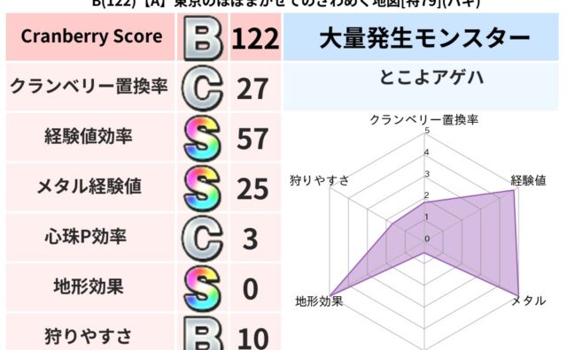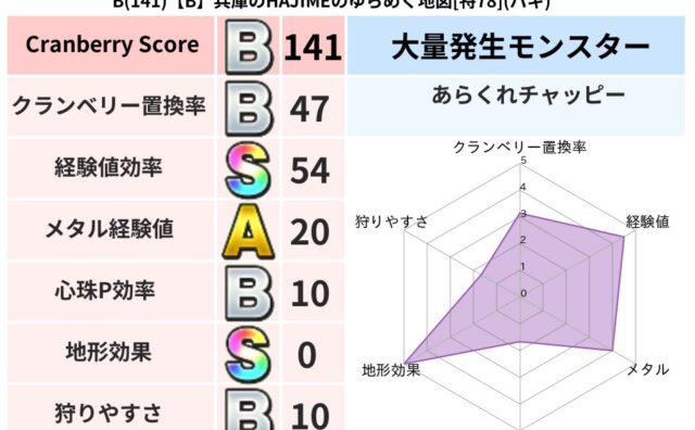 クランベリーボット判定結果の詳細クランベリースコア102クランベリー置換率62%大量発生モンスタードラゴンキッズ超耐性バギ(76%)こころ道 完全一致モンスターくさった死体ゴッドハンド(守護道Lv5)大魔道士(魔力道Lv5)キースドラゴン大...