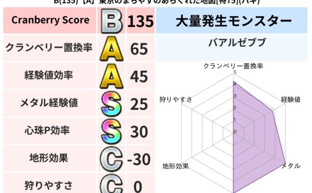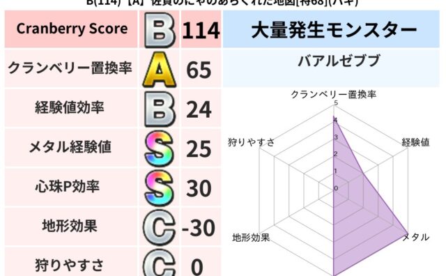 クランベリーボット判定結果の詳細クランベリースコア114クランベリー置換率65%大量発生モンスターバアルゼブブ超耐性バギ(46%)こころ道 完全一致モンスターヘルボックル魔剣士(魔道Lv30)シャドーニンジャ(波道Lv30)マジカルハット大...