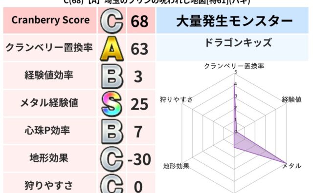 クランベリーボット判定結果の詳細クランベリースコア160クランベリー置換率68%大量発生モンスターヒョウモンダーク超耐性バギ(0%)超耐性・弱耐性なしジバリアこころ道 完全一致モンスターどくどくゾンビ魔剣士(共通Lv1)デビルアーマー大神官...
