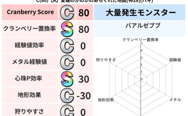クランベリーボット判定結果の詳細クランベリースコア:135クランベリー置換率:60%大量発生モンスター:クリスタルハンドバギ超耐性(78%)系統狩り(43%)こころ道 完全一致モンスターグリゴンダンス魔人(超魔道Lv5)メイジキメラゴッドハ...