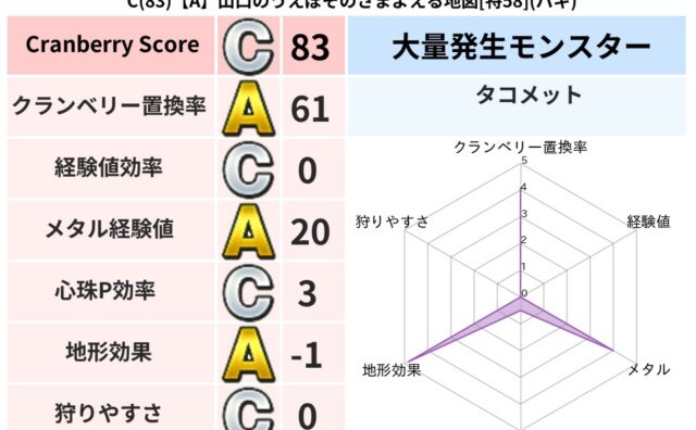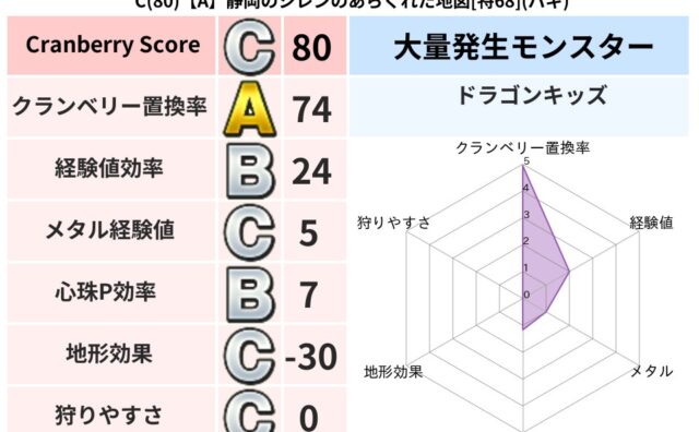 クランベリーボット判定結果の詳細クランベリースコア:141クランベリー置換率:19%大量発生モンスター:プチアーノンバギ超耐性(0%)超耐性・弱耐性なし:メラ,イオ,デイン系統狩り(45%)こころ道 完全一致モンスタープチアーノン: 大神官...
