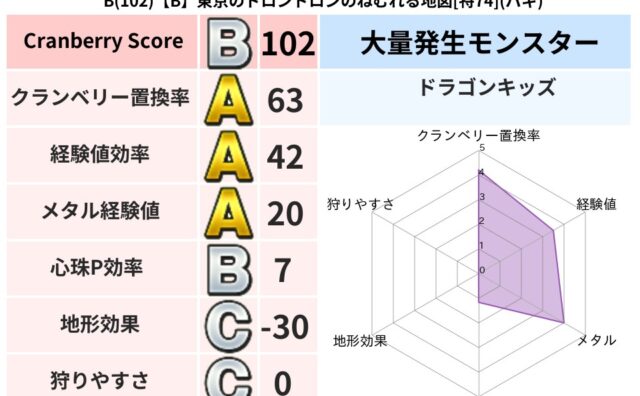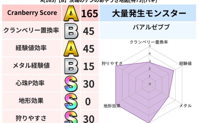 クランベリーボット判定結果の詳細クランベリースコア:119クランベリー置換率:63%大量発生モンスター:タホドラキーバギ超耐性(9%)こころ道 完全一致モンスターどくイモムシニンジャ(波道Lv5)がいこつ魔剣士(共通Lv1)つかいま大魔導士...
