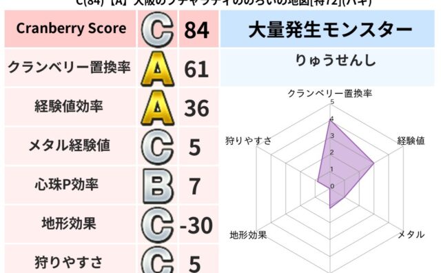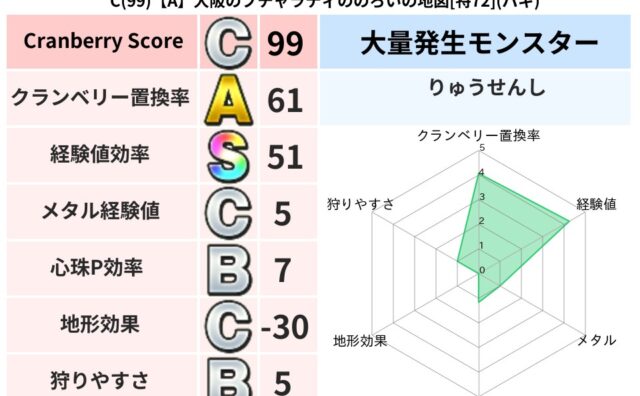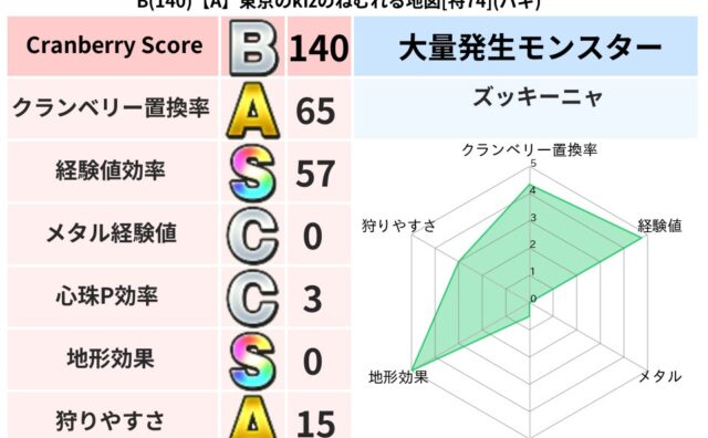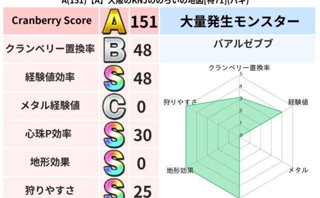 クランベリーボット判定結果の詳細クランベリースコア151クランベリー置換率48%大量発生モンスターバアルゼブブ超耐性バギ(0%)超耐性・弱耐性なしジバリアこころ道 完全一致モンスターどくろあらいゴッドハンド(守護道Lv5)どくイモムシニンジ...