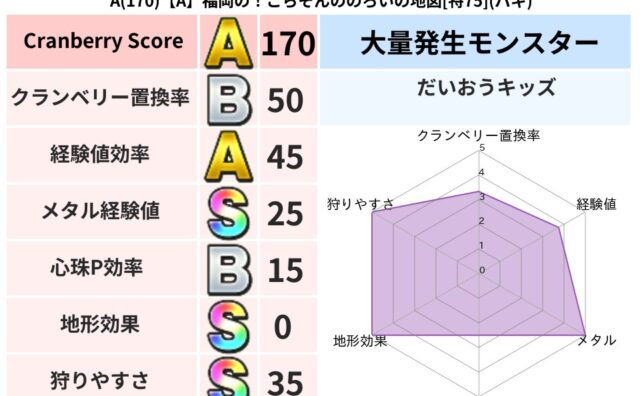 クランベリーボット判定結果の詳細クランベリースコア175クランベリー置換率50%大量発生モンスターだいおうキッズ超耐性バギ(0%)超耐性・弱耐性なしデインこころ道 完全一致モンスターどくろあらいゴッドハンド(守護道Lv5)さまようよろいゴッ...