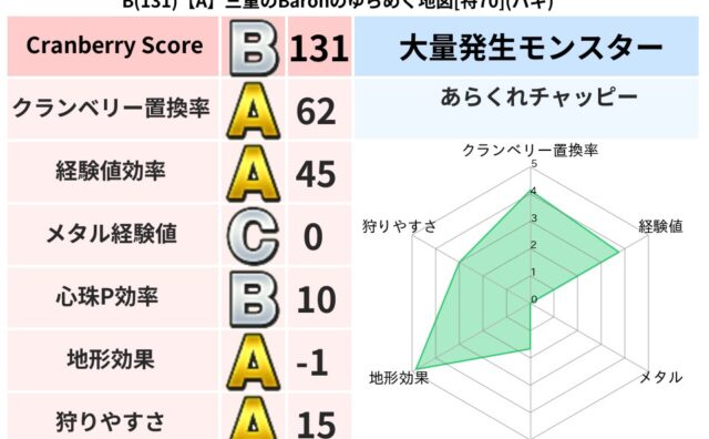 クランベリーボット判定結果の詳細クランベリースコア178クランベリー置換率79%大量発生モンスターバアルゼブブ超耐性バギ(0%)超耐性・弱耐性なしデインこころ道 完全一致モンスターヘルボックル魔剣士(魔道Lv30)ストーンマンゴッドハンド(...