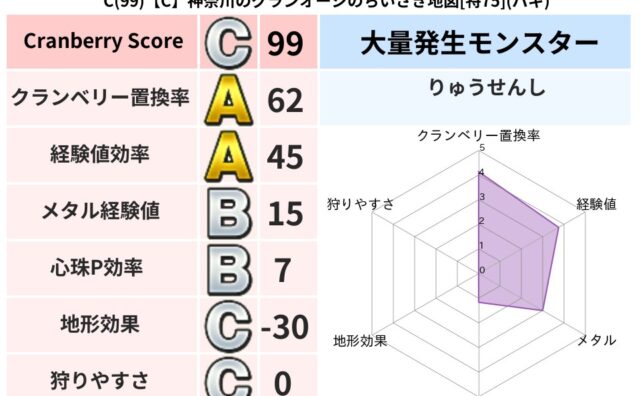 クランベリーボット判定結果の詳細クランベリースコア:126クランベリー置換率:63%大量発生モンスター:マリンスライムバギ超耐性(0%)超耐性・弱耐性なし:デインこころ道 完全一致モンスターどくイモムシニンジャ(波道Lv5)どれいへいしドラ...