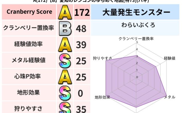 クランベリーボット判定結果の詳細クランベリースコア:91クランベリー置換率:60%大量発生モンスター:メーダロード,げんじゅつしバギ超耐性(5%)こころ道 完全一致モンスターキメラ大魔導士(共通Lv1)デビルアーマー大神官(舞道Lv5)てつ...
