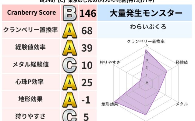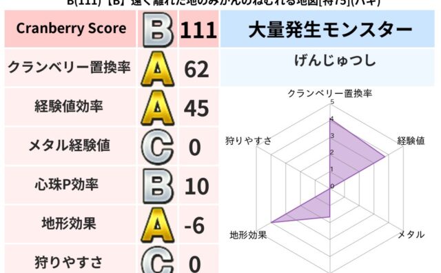 クランベリーボット判定結果の詳細クランベリースコア151クランベリー置換率48%大量発生モンスターバアルゼブブ超耐性バギ(0%)超耐性・弱耐性なしジバリアこころ道 完全一致モンスターどくろあらいゴッドハンド(守護道Lv5)どくイモムシニンジ...