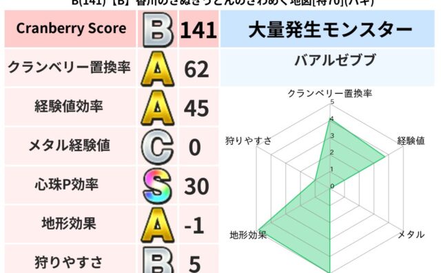 クランベリーボット判定結果の詳細クランベリースコア:133クランベリー置換率:69%大量発生モンスター:ヒョウモンダークバギ超耐性(1%)こころ道 完全一致モンスターてつのさそりゴッドハンド(守護道Lv5),大魔導士(魔力道Lv5)リカント...