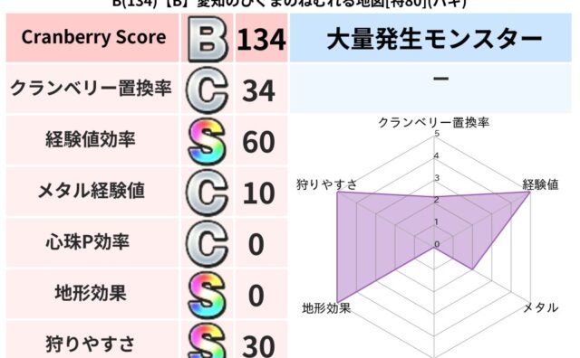 クランベリーボット判定結果の詳細クランベリースコア137クランベリー置換率67%大量発生モンスターさそりばち超耐性バギ(6%)こころ道 完全一致モンスターどくろあらいゴッドハンド(守護道Lv5)キメラ大魔道士(共通Lv1)ストーンマンゴッド...