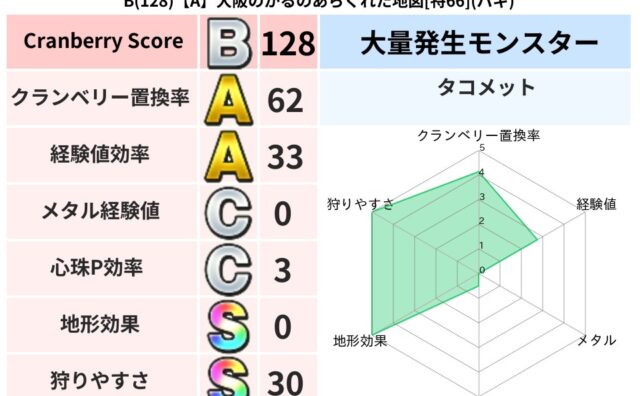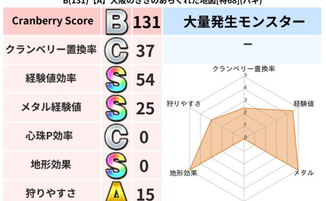 クランベリーボット判定結果の詳細クランベリースコア:100クランベリー置換率:64%大量発生モンスター:ズッキーニャバギ超耐性(50%)系統狩り(41%)こころ道 完全一致モンスターヘルボックル魔剣士(魔道Lv30)がいこつ魔剣士(共通Lv...