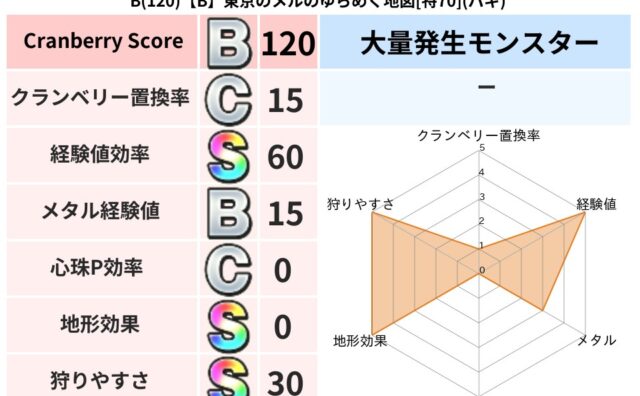 クランベリーボット判定結果の詳細クランベリースコア:152クランベリー置換率:39%大量発生モンスター:ブラッドソードバギ超耐性(0%)系統狩り(66%)こころ道 完全一致モンスターばくだん岩: 大神官(舞道Lv5)ストーンマン: ゴッドハ...