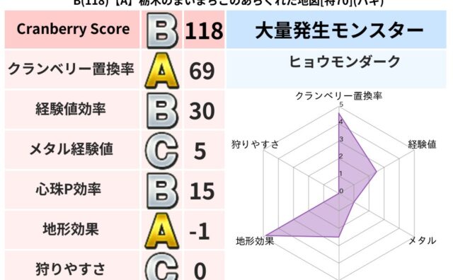 クランベリーボット判定結果の詳細クランベリースコア:93クランベリー置換率:60%大量発生モンスター:さそりばち,じごくのもんばんバギ超耐性(75%)こころ道 完全一致モンスターキャットフライ: ニンジャ(共通Lv1)ナイトキャット: 守り...