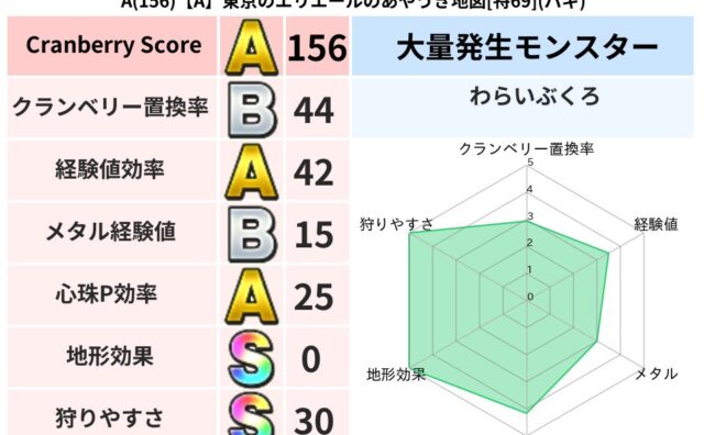 クランベリーボット判定結果の詳細クランベリースコア:213クランベリー置換率:81%大量発生モンスター:バアルゼブブバギ超耐性(0%)こころ道 完全一致モンスターどくろあらい: ゴッドハンド(守護道Lv5)デビルアーマー: 大神官(舞道Lv...