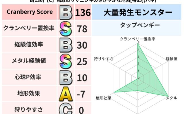 クランベリーボット判定結果の詳細クランベリースコア136クランベリー置換率78%大量発生モンスタータップペンギー超耐性バギ(6%)こころ道 完全一致モンスターどくろあらいゴッドハンド(守護道Lv5)しのどれいゴッドハンド(守護道Lv5)大魔...