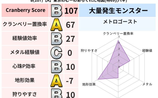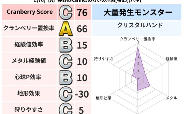 クランベリーボット判定結果の詳細クランベリースコア163クランベリー置換率63%大量発生モンスターわらいぶくろ超耐性バギ(0%)系統狩り物質系56%こころ道 完全一致モンスターばくだん岩大神官(舞道Lv5)ストーンマンゴッドハンド(守護道L...