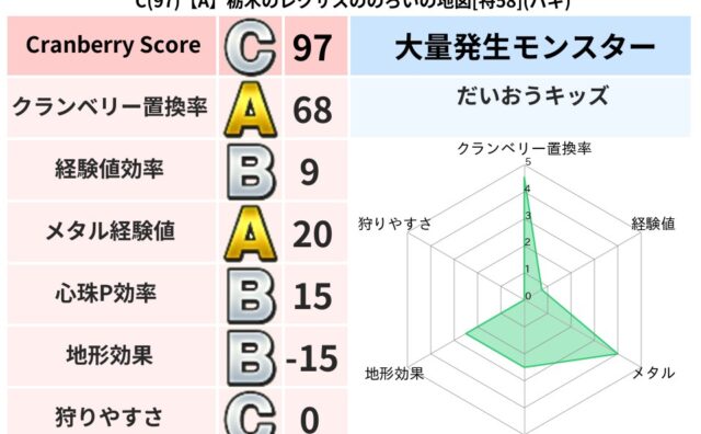 クランベリーボット判定結果の詳細クランベリースコア:87クランベリー置換率:62%大量発生モンスター:モコモコじゅうバギ超耐性(50%)こころ道 完全一致モンスターヘルボックル魔剣士(魔道Lv30)デビルアーマー大神官(舞道Lv5)モコモコ...
