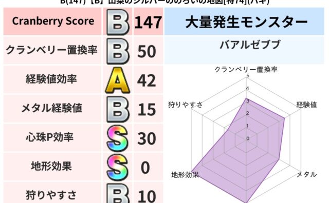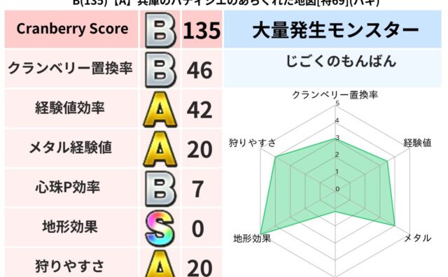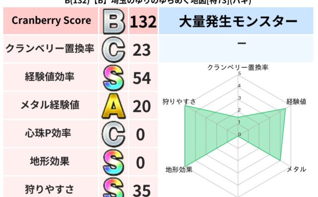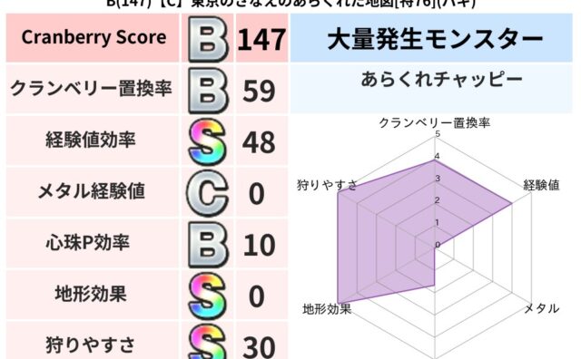クランベリーボット判定結果の詳細クランベリースコア147クランベリー置換率59%大量発生モンスターあらくれチャッピー超耐性バギ(0%)こころ道 完全一致モンスタースカルガルードラゴン(竜道Lv5)ヒートギズモ守り人(ささえ道Lv5)ベビーサ...