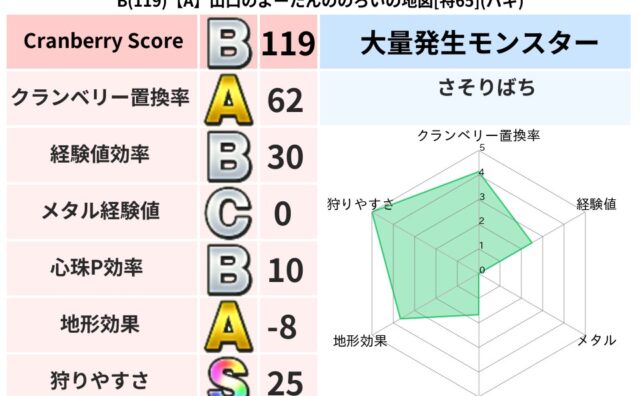 クランベリーボット判定結果の詳細クランベリースコア:106クランベリー置換率:66%大量発生モンスター:モコモコじゅうバギ超耐性(0%)こころ道 完全一致モンスターベビーサラマンダ大神官(舞道Lv5)アイアンクック守り人(まもり道Lv5)モ...