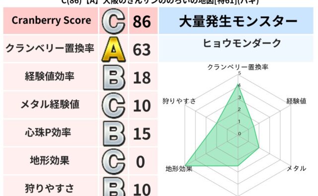 クランベリーボット判定結果の詳細クランベリースコア:81クランベリー置換率:63%大量発生モンスター:マポレーナバギ超耐性(0%)系統狩り(41%)こころ道 完全一致モンスターみならいあくま: ニンジャ(風道Lv5)フロストギズモ: 魔剣士...