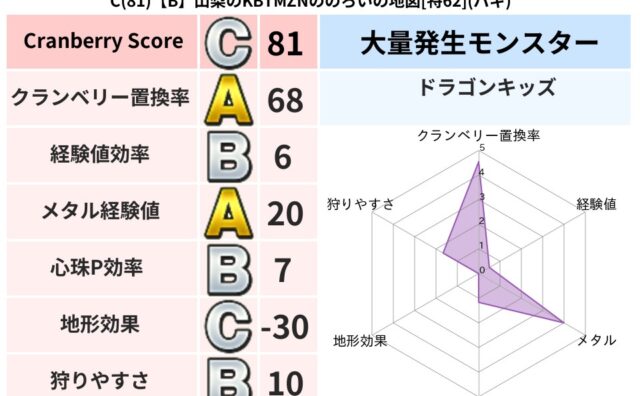 クランベリーボット判定結果の詳細クランベリースコア:111クランベリー置換率:68%大量発生モンスター:ドラゴンキッズバギ超耐性(0%)こころ道 完全一致モンスターデビルアーマー: 大神官(舞道Lv5)リカントマムル: ドラゴン(竜道Lv5...
