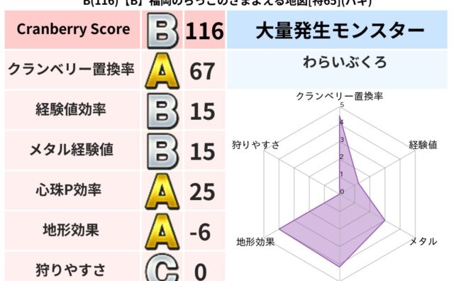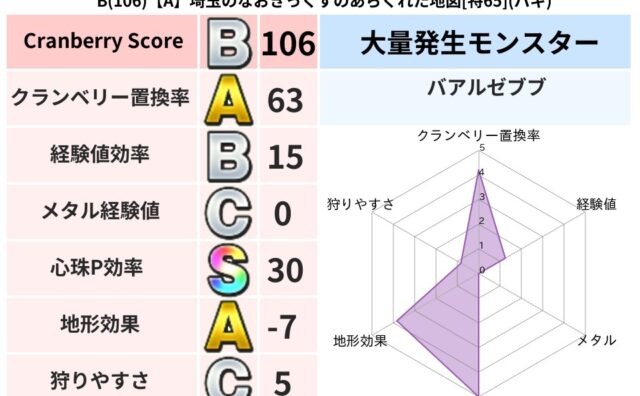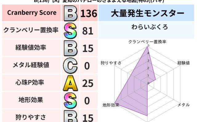 クランベリーボット判定結果の詳細クランベリースコア116クランベリー置換率67%大量発生モンスターわらいぶくろ超耐性バギ(5%)こころ道 完全一致モンスターねこまどうニンジャ(風道Lv5)デビルアーマー大神官(舞道Lv5)りゅうき兵天地雷鳴...