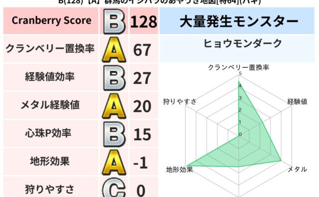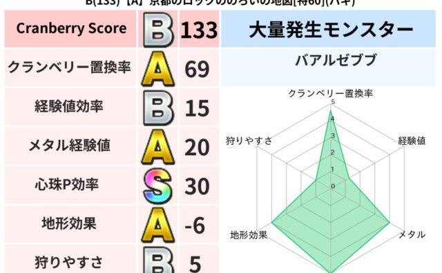 クランベリーボット判定結果の詳細クランベリースコア:115クランベリー置換率:64%大量発生モンスター:わらいぶくろバギ超耐性(5%)こころ道 完全一致モンスターリカントマムルドラゴン(竜道Lv5)ぐんたいガニ守り人(ささえ道Lv10)ポン...